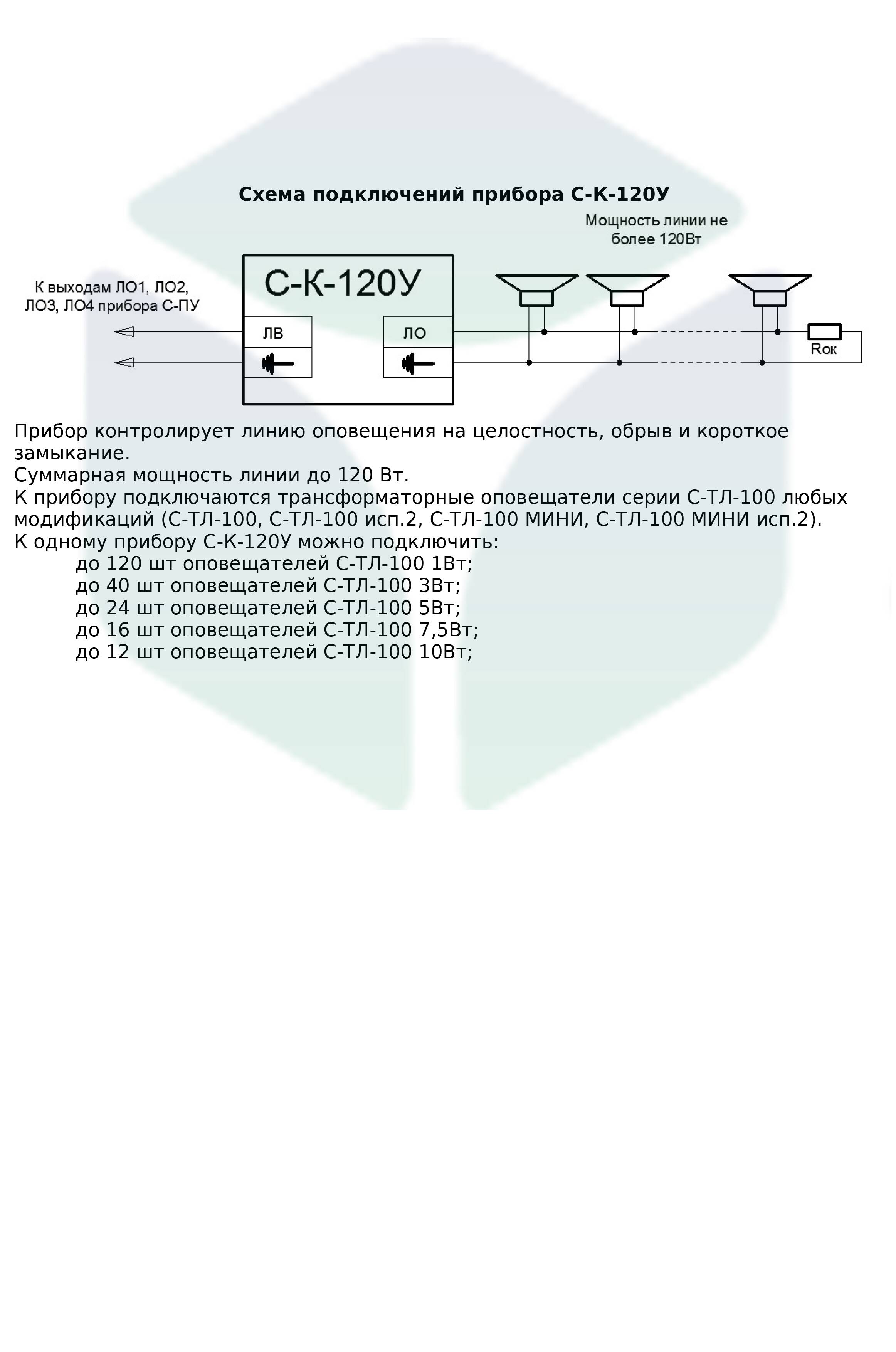 «С-К-120У» предназначенный для трансляции речевых сообщений в системах пожарной сигнализации на объектах различной степенисложности, с контролем линии оповещения. Прибор подключается к прибору управления речевым оповещением «С-ПУ» на каждую линию оповещения не более 10шт.
